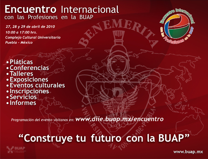 Cuando tenemos que decidir qué carrera vamos a estudiar, una serie de preguntas nos invaden. Todas podrán encontrar respuesta en la Encuentro Internacional con las Profesiones en la BUAP, evento que te permitirá conocer la oferta académica de la Benemérita y un acercamiento real a lo que hace cada licenciatura. Habrá congresos, seminarios, foros, servicios e informes para los estudiantes de 10:00 a 17:00 hrs. Es entrada libre y lo mejor de todo es que estaremos por allá.